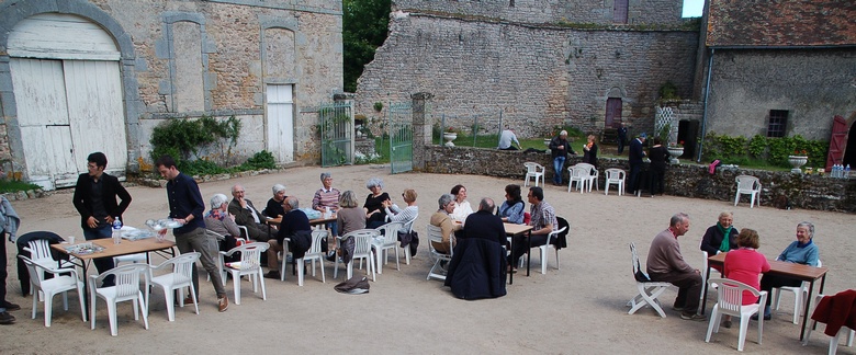 Les communications (ci-dessous) ont été présentées dans la grande salle du château de Brandon, mais un colloque est aussi l'occasion d'échanges entre les participants. Sous un ciel irréprochable, la cour du château s'y prêtait parfaitement.